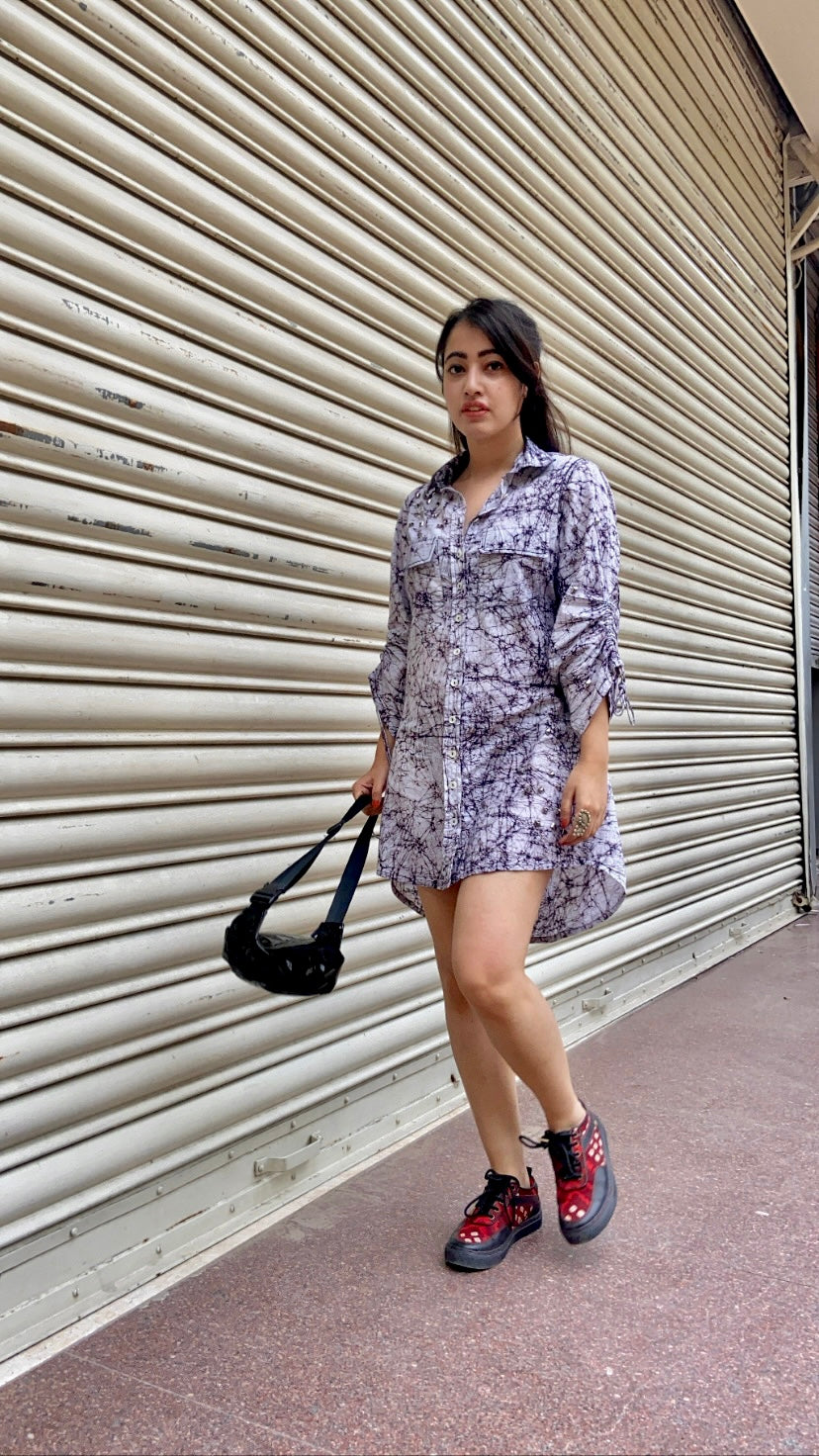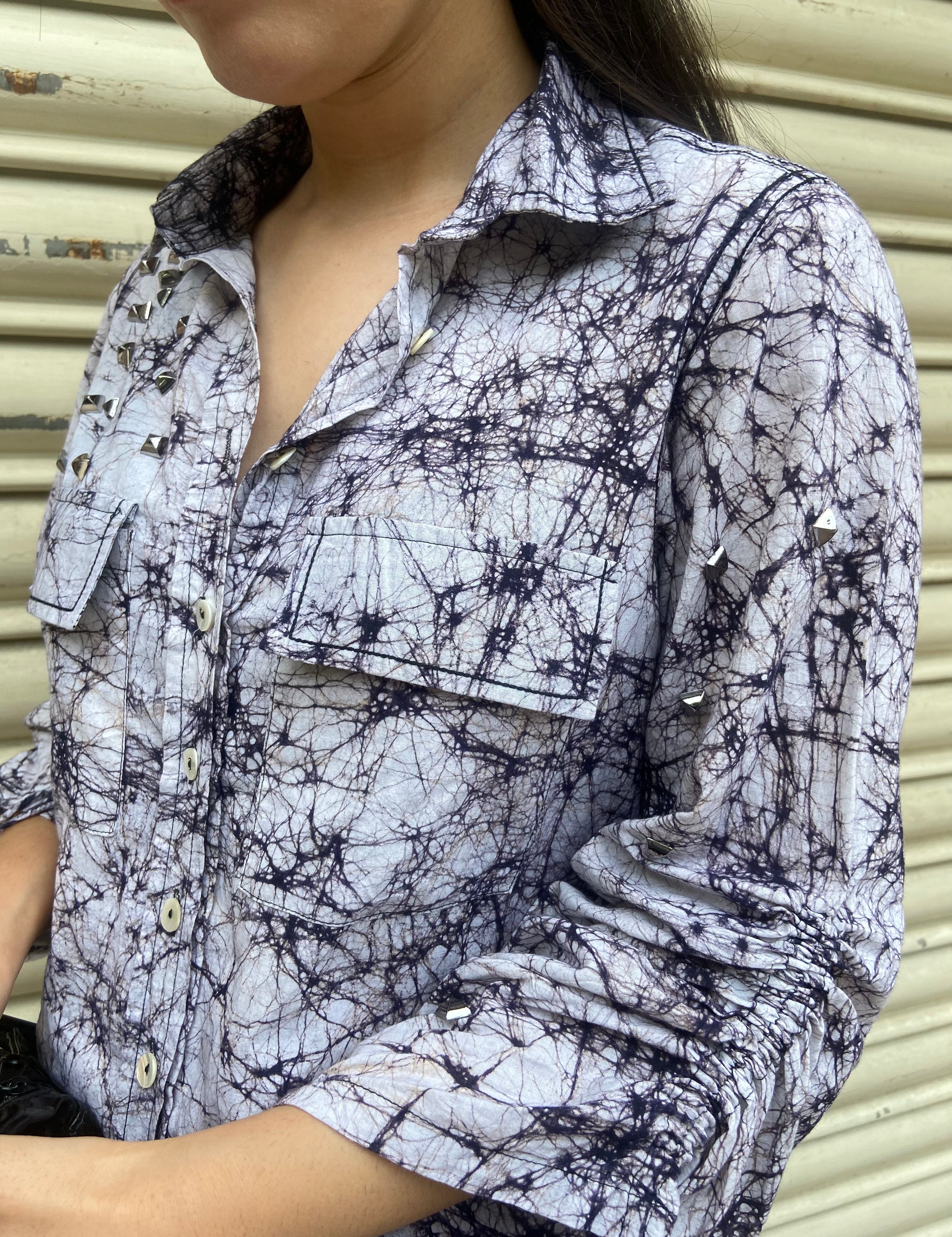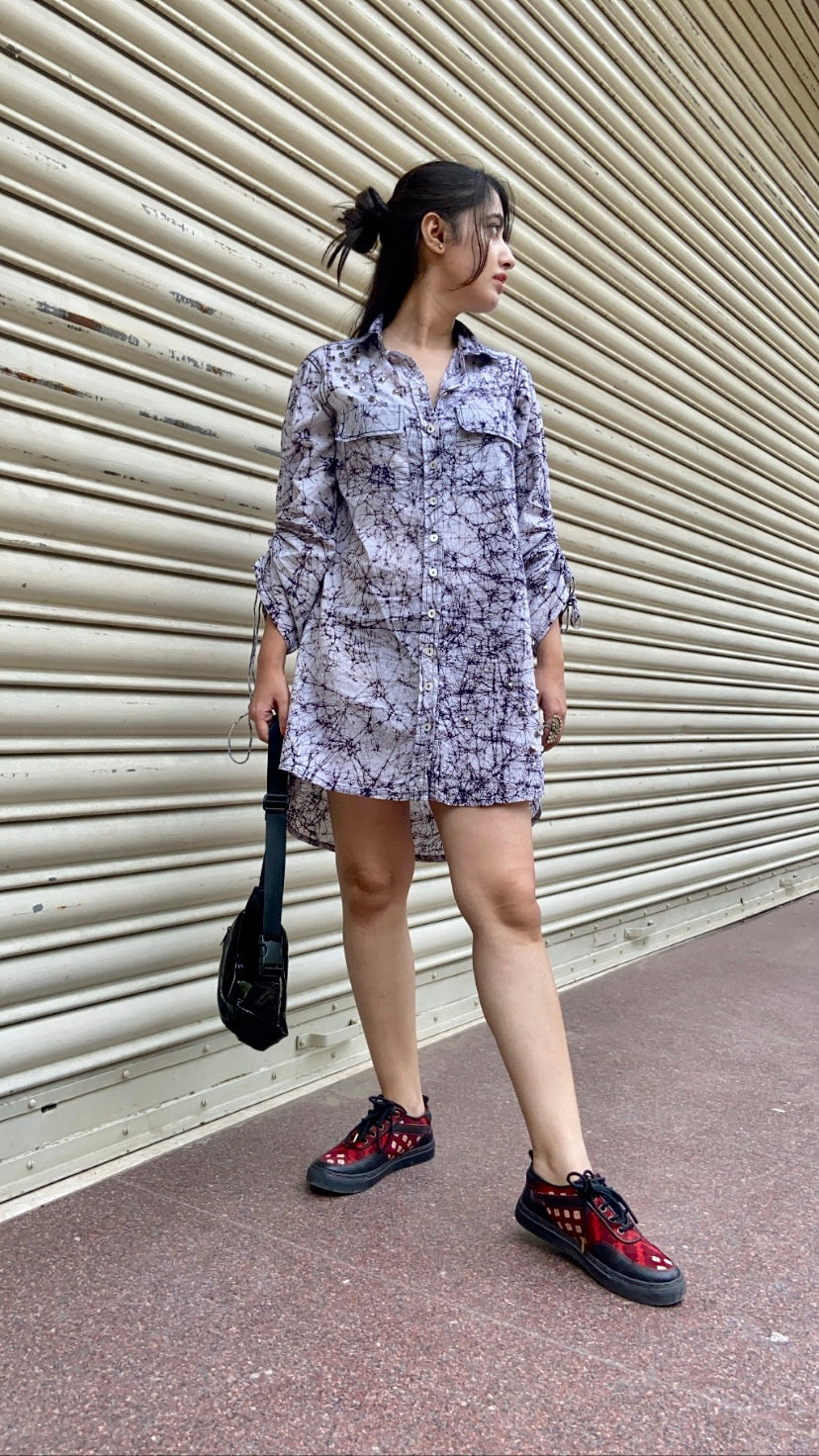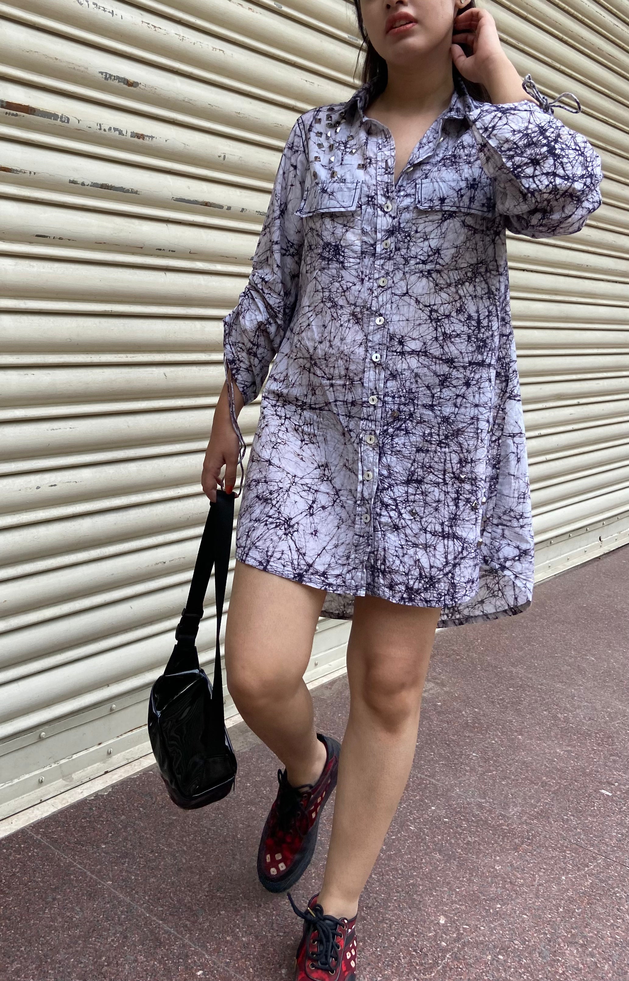 Swaroop Exclusive Design. Manjha Shirt Dress is a marriage between Indian textile and modern silhouette. The Fabric of the shirt is hand printed in Gujarat using traditional technique of Batik. The front panel is embellished with studs. Wear it and flaunt it a little bit everywhere you go.