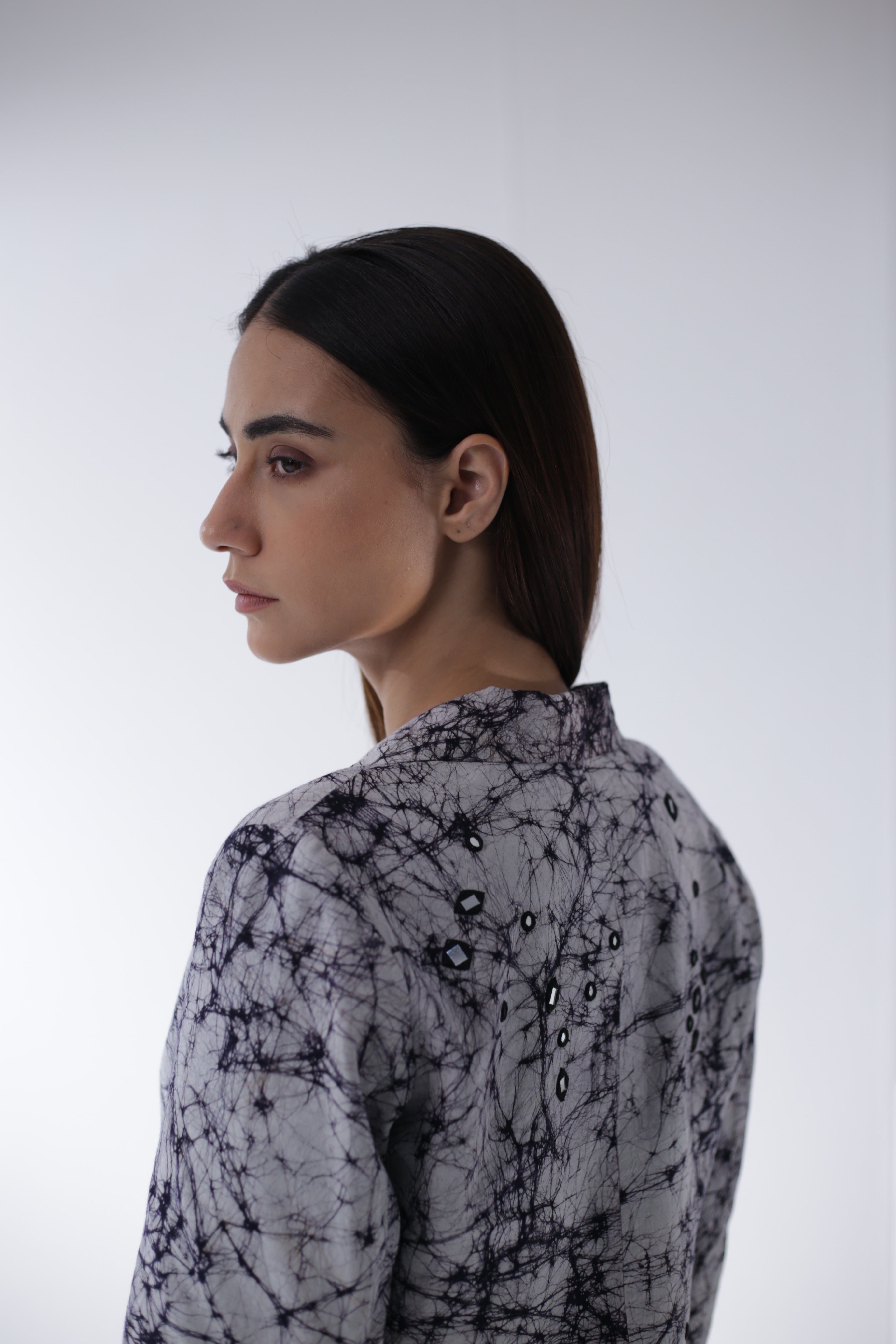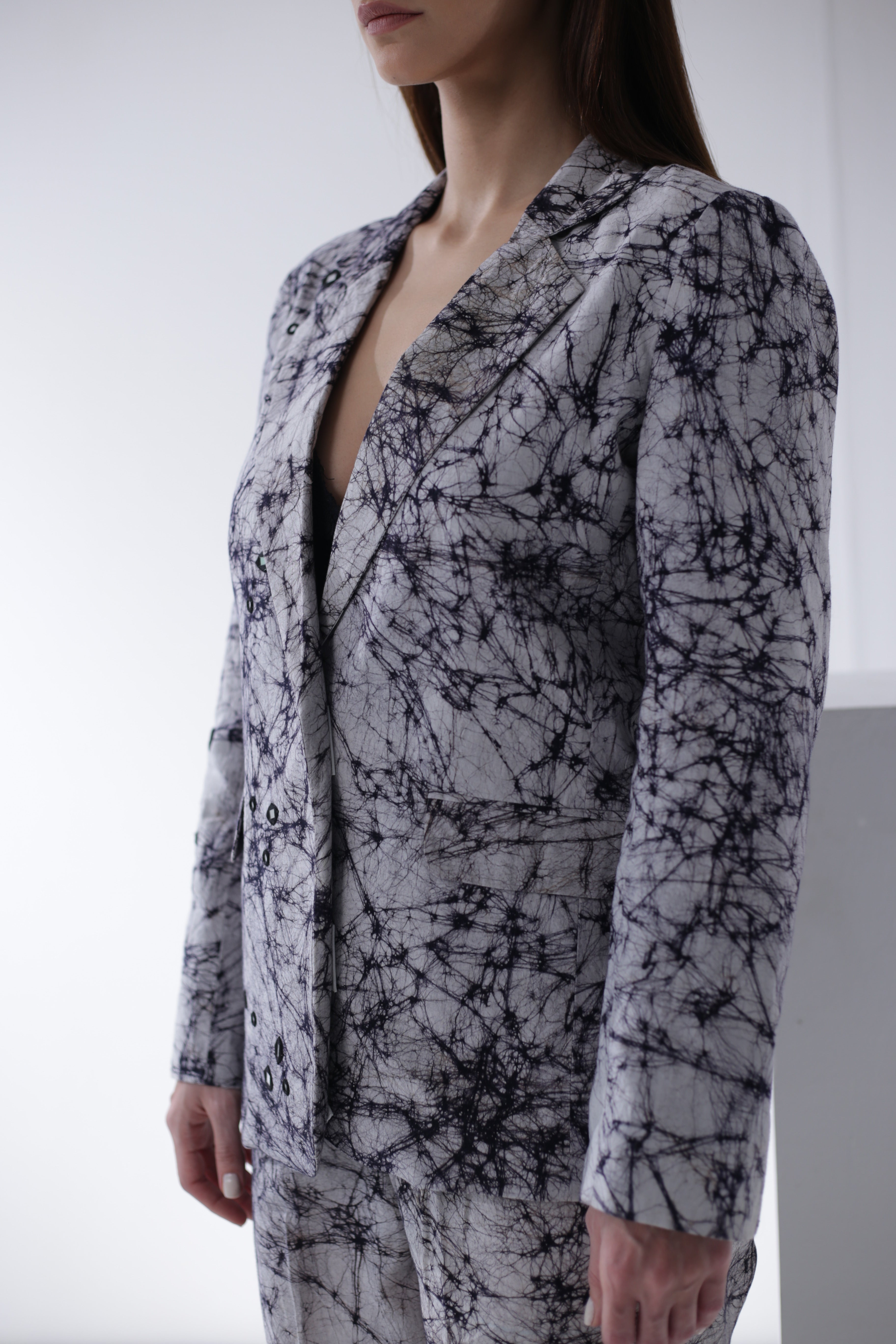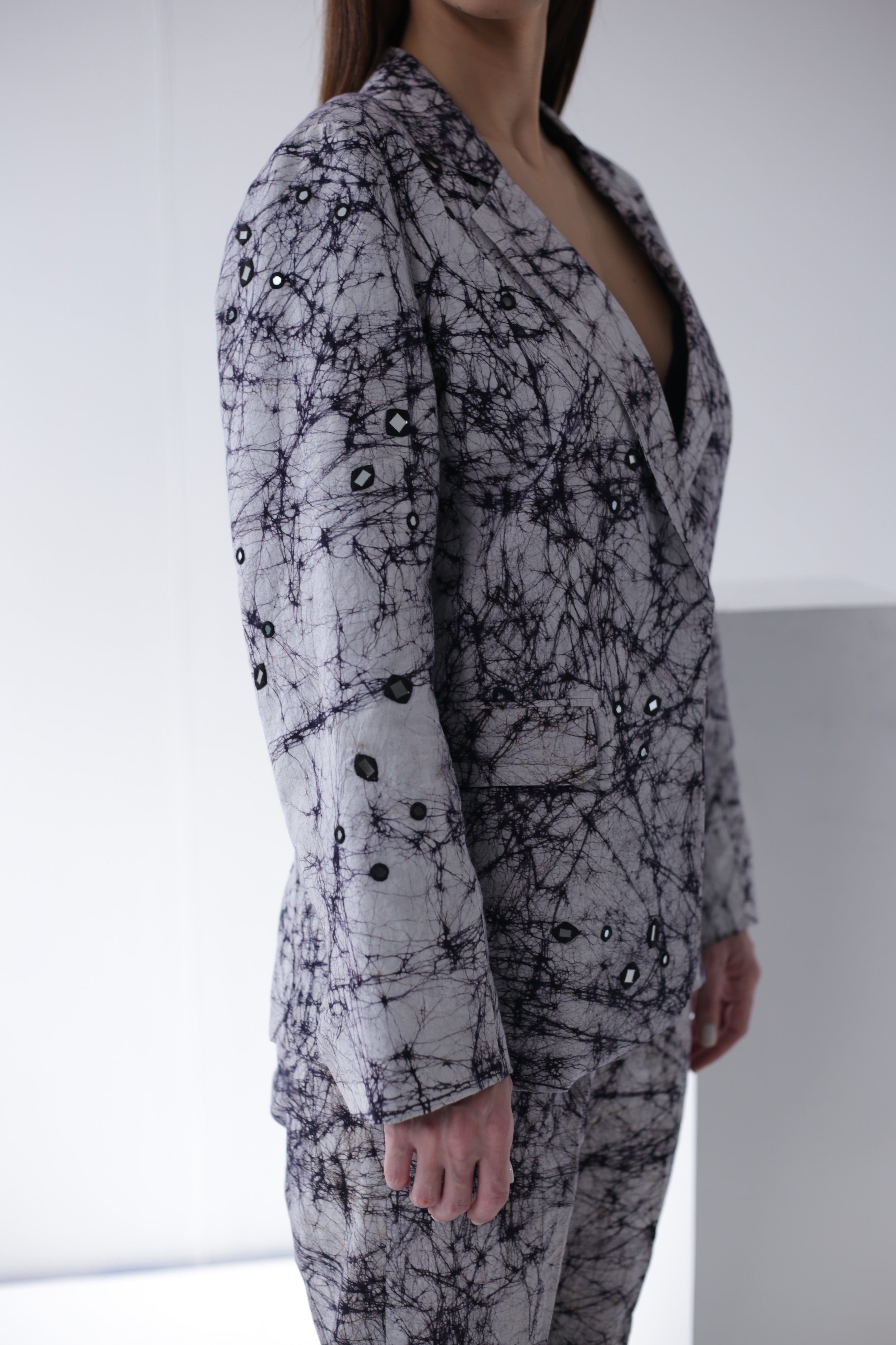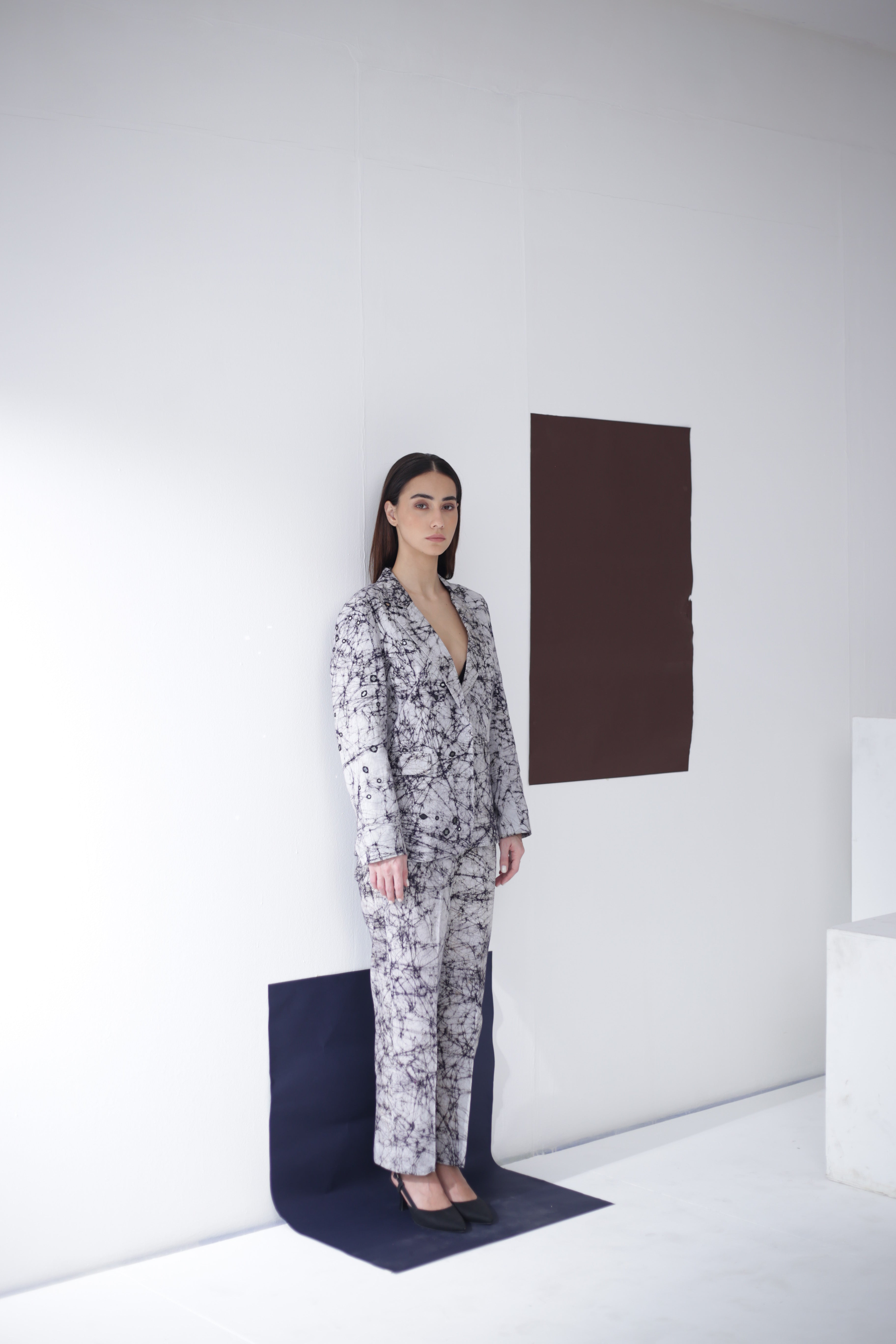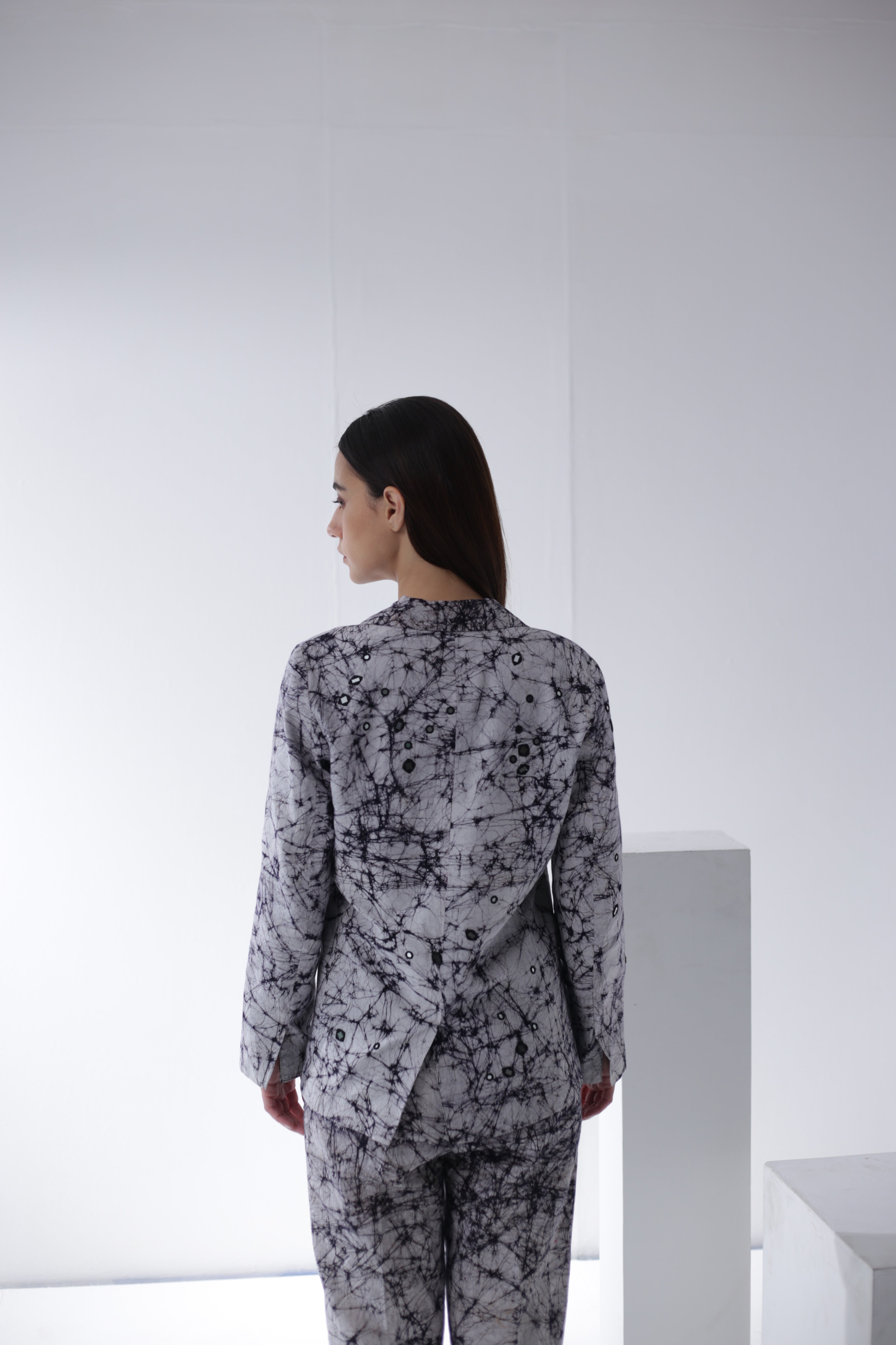 Swaroop Exclusive Design. Wabi- Sabi Pant Suit is a marriage between Indian textile and modern silhouette. The Fabric of the pant suit is hand printed in Gujarat using traditional technique of Batik. The blazer is in tailored fit. Embellished with hand embroidered mirror work all over. Paired with straight fit pants.