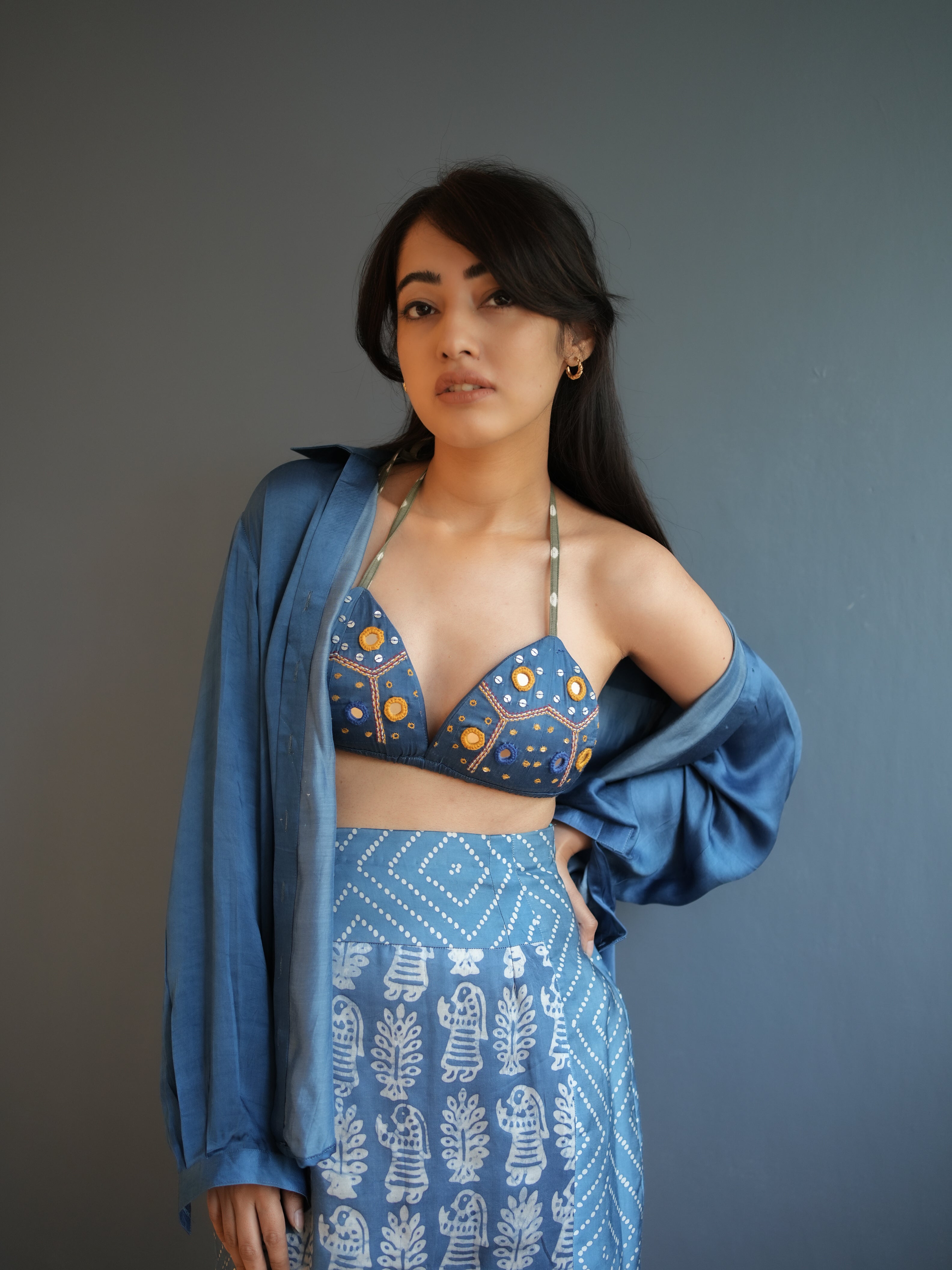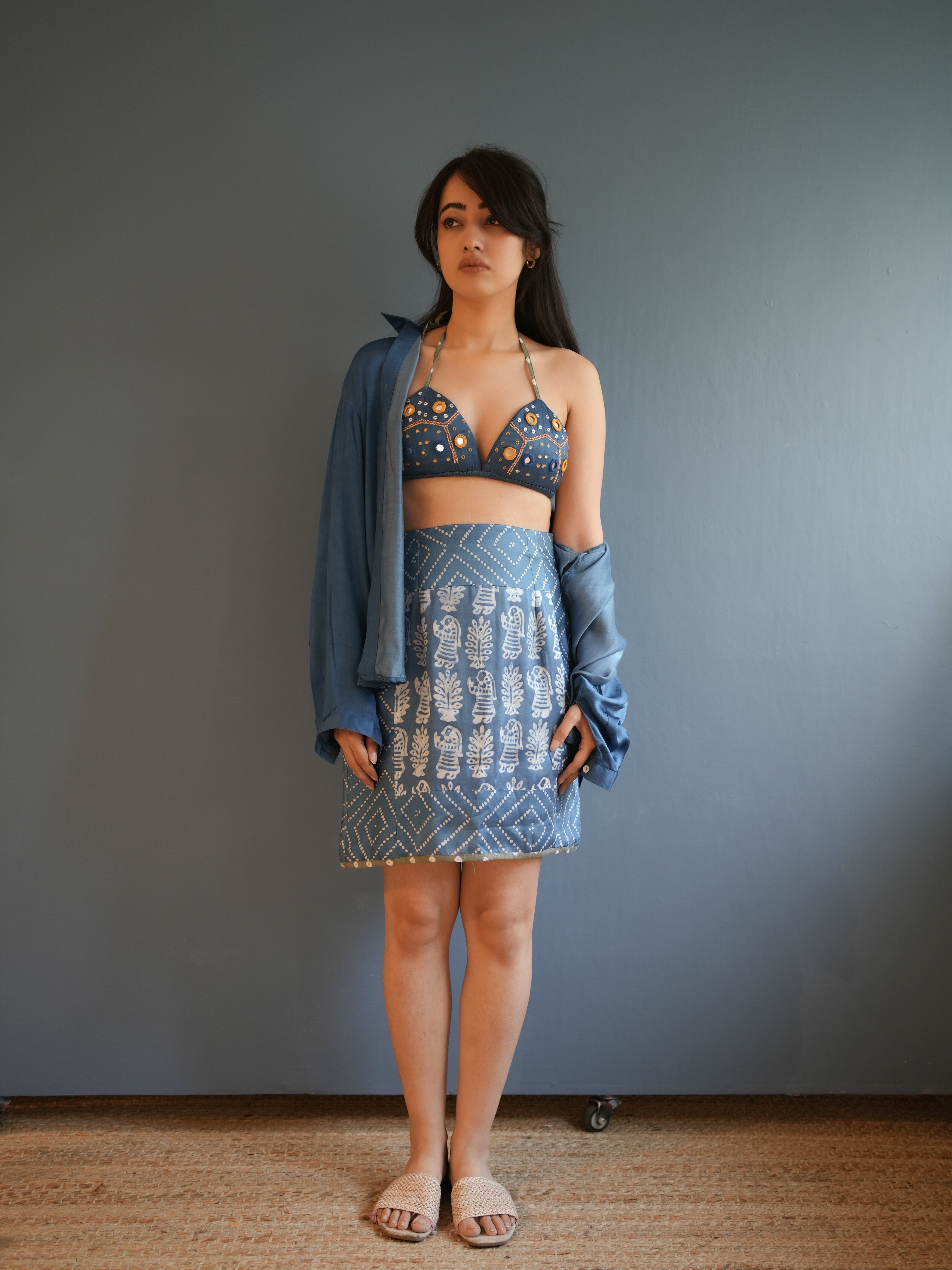 Swaroop Exclusive Collection, this A-line Vaari short skirt is crafted from luxurious Bemberg Satin, offering a soft sheen and graceful movement. The standout panel patchwork design features a striking Blue Farm Lady motif on the central panel, framed by diamond dot motifs on the side and upper panels, and intricately finished with grey Bandhani piping along the hem. Finished with a clean side zipper closure, it creates a sleek, flattering silhouette.
