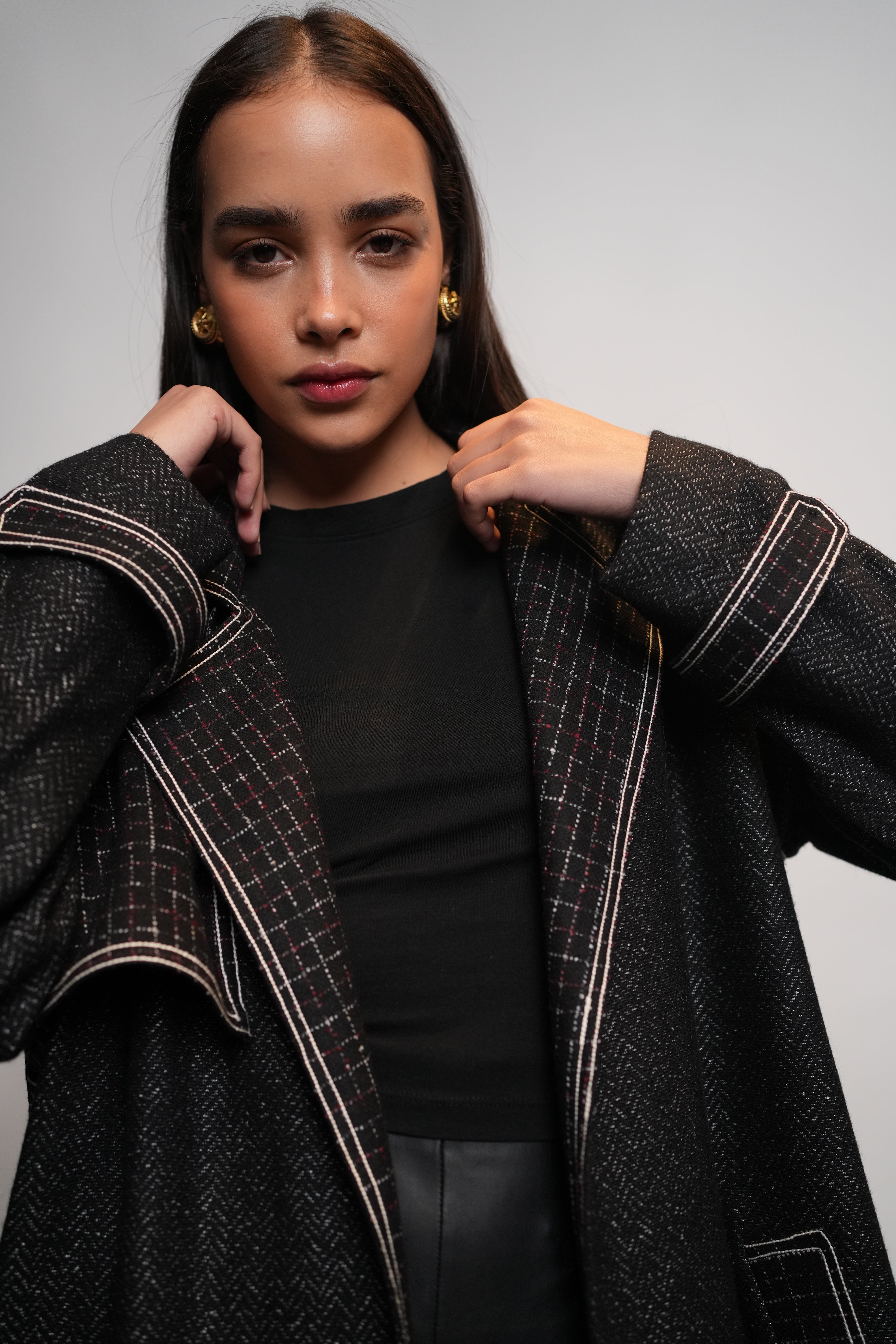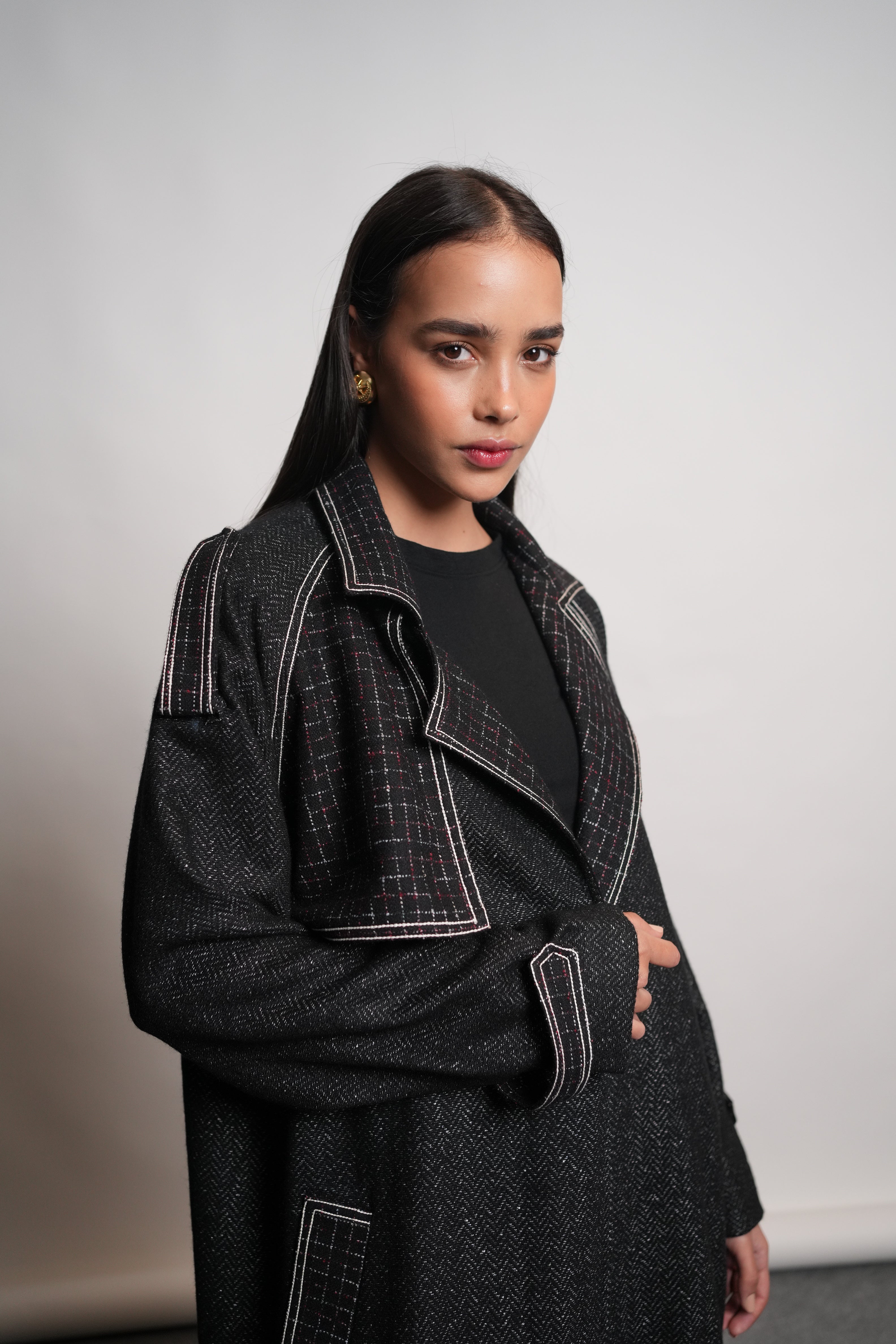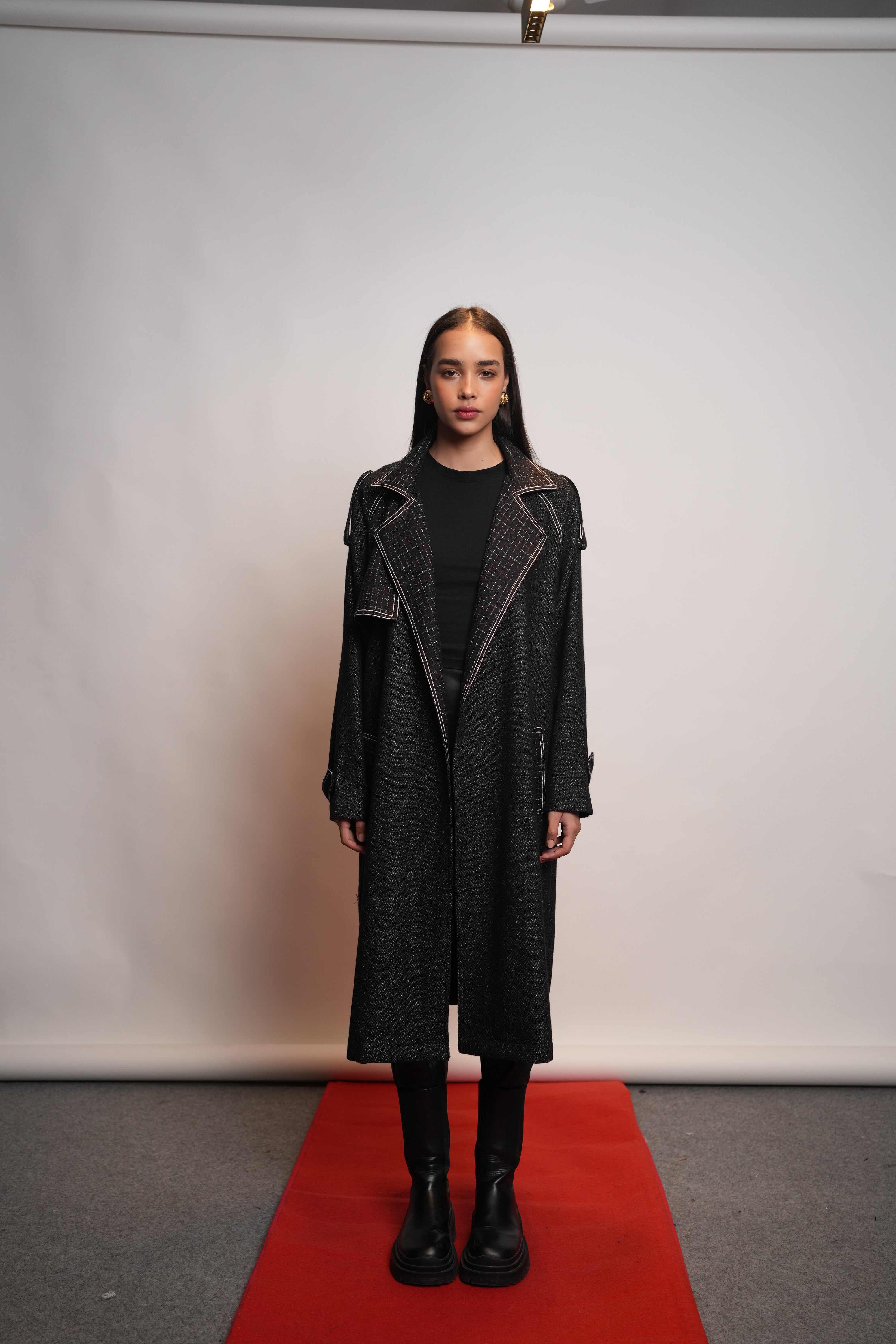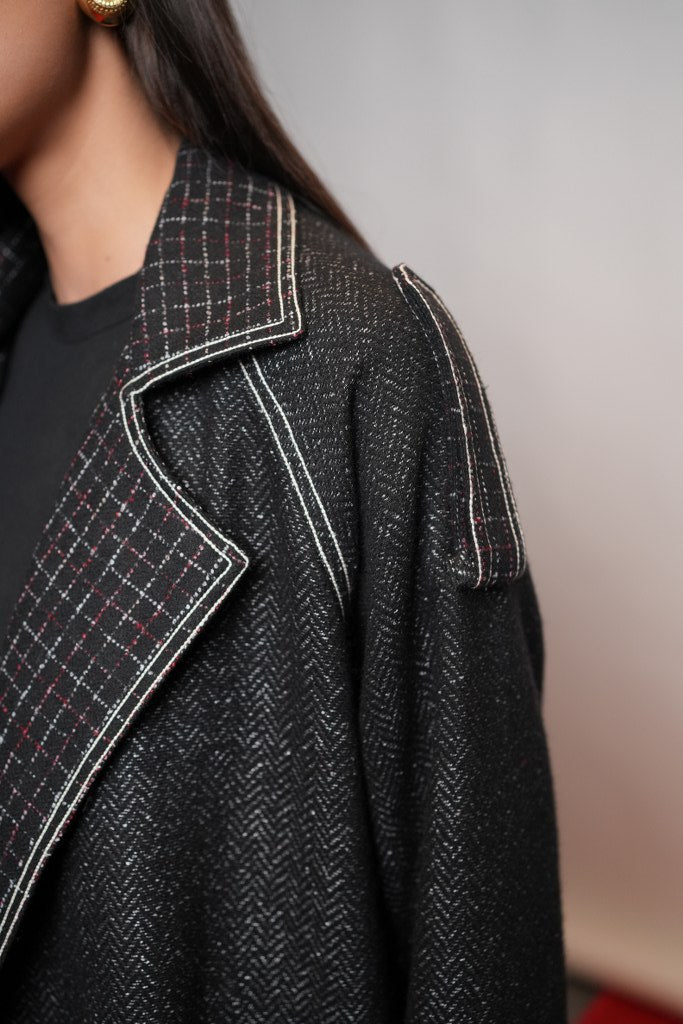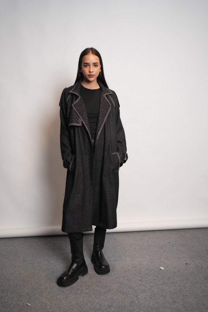 Swaroop Exclusive Design: A sleek black trench coat crafted from a premium wool blend fabric. It stands out with its checked collar and pockets, enhanced by thick stitched detailing along the hems. The design includes loops on the shoulders and sleeves for a structured look, along with open flaps on both the front and back that add both style and comfort.