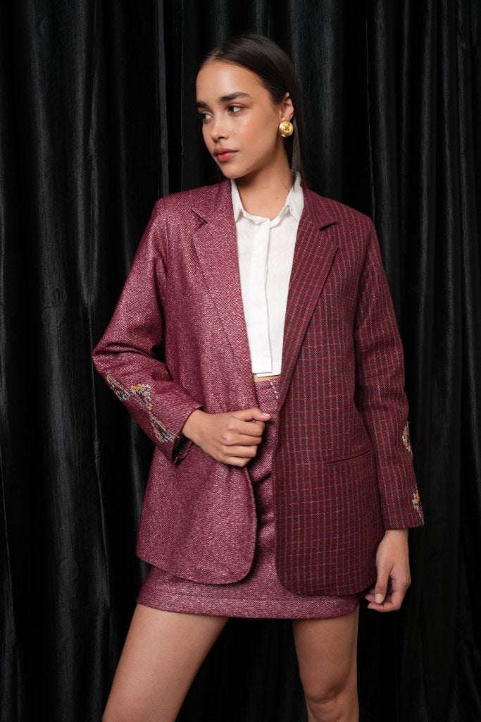 Crafted from a premium wool blend fabric, the front panels are divided into two sections the right side in smooth twill and the left in a classic checked pattern, seamlessly joined at the back to create an elegant slit. The blazer is designed with a notched lapel collar for a refined look. The sleeves are adorned with block-printed Kalamkari patchwork, and flap pockets on both sides offer both style and practicality.