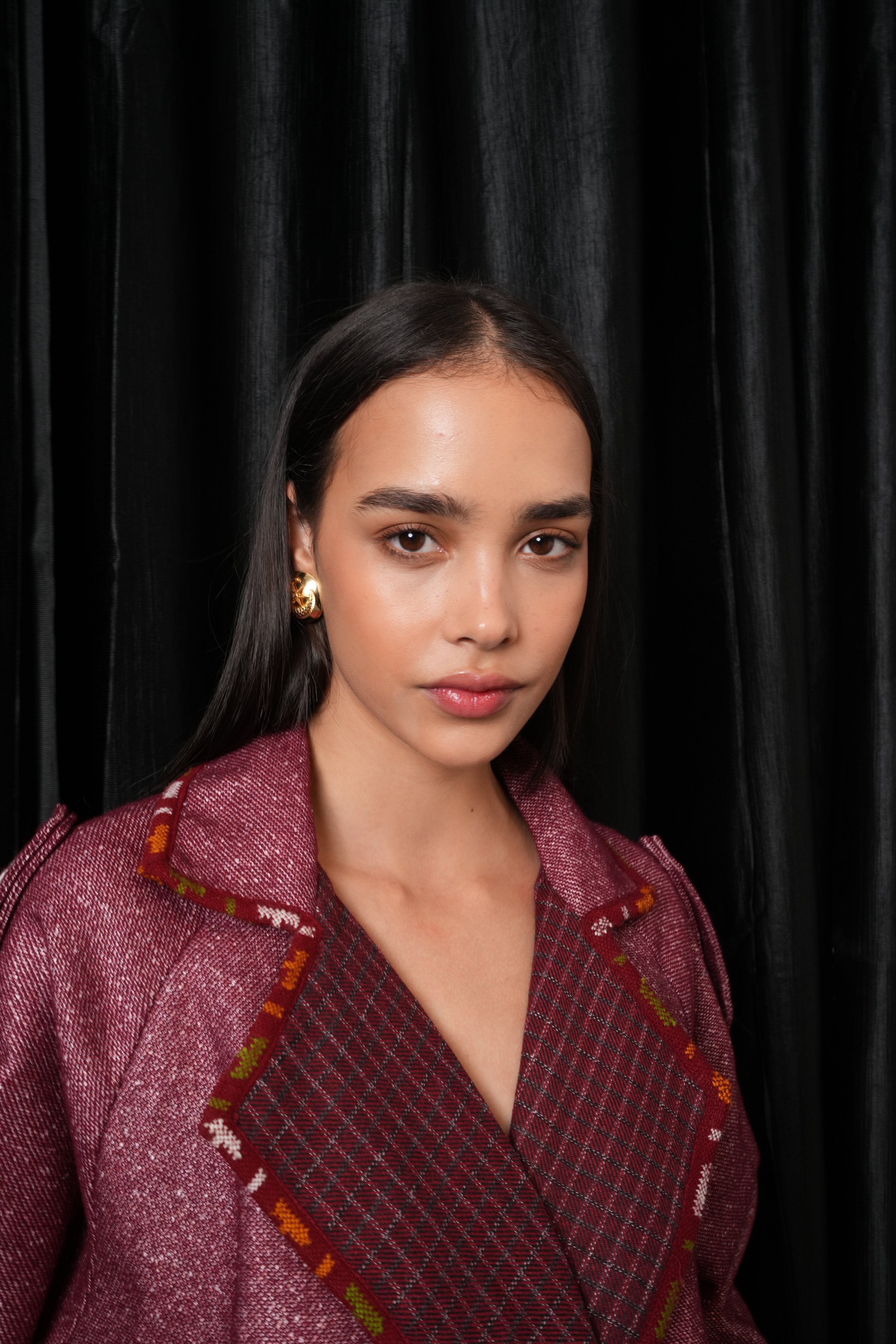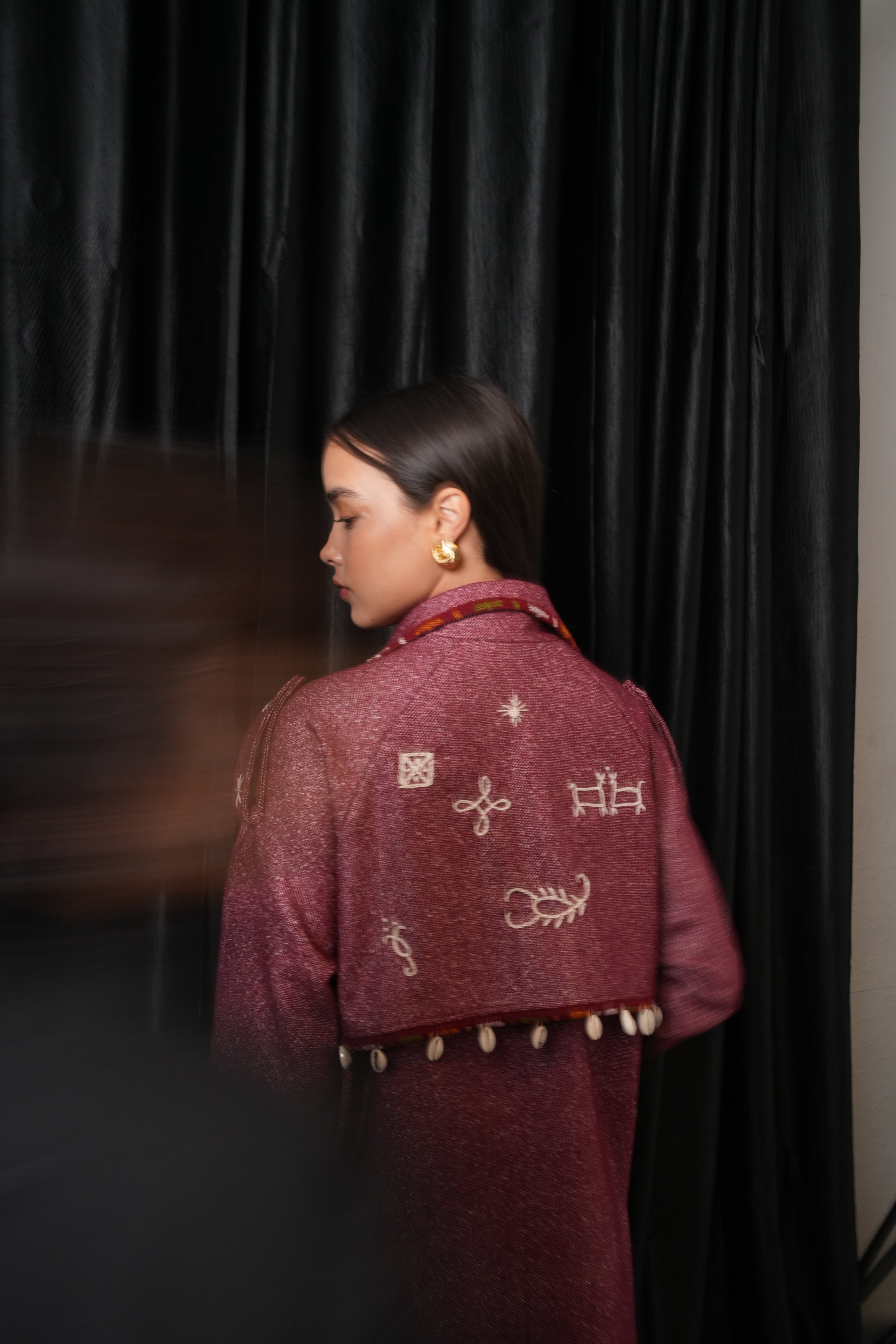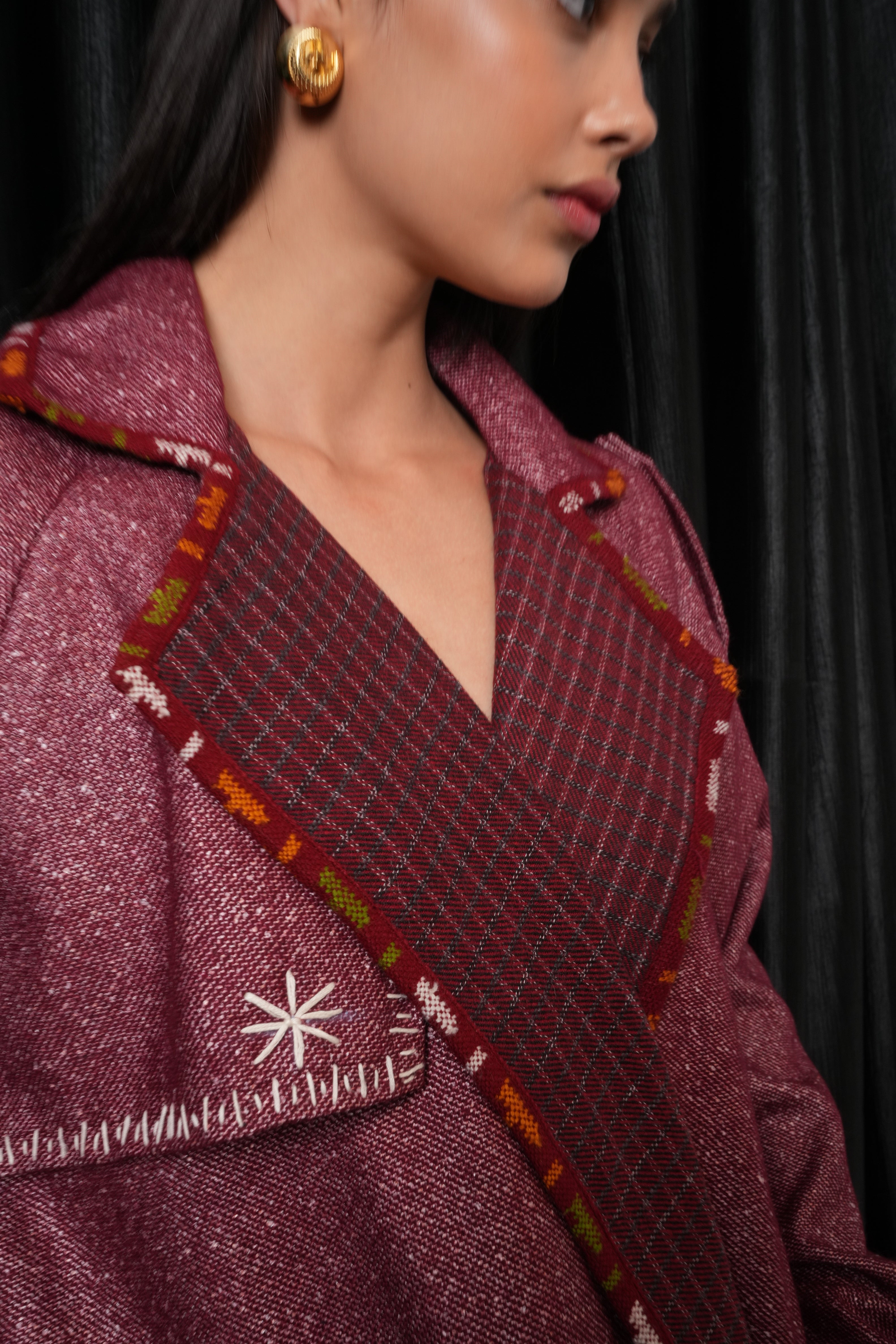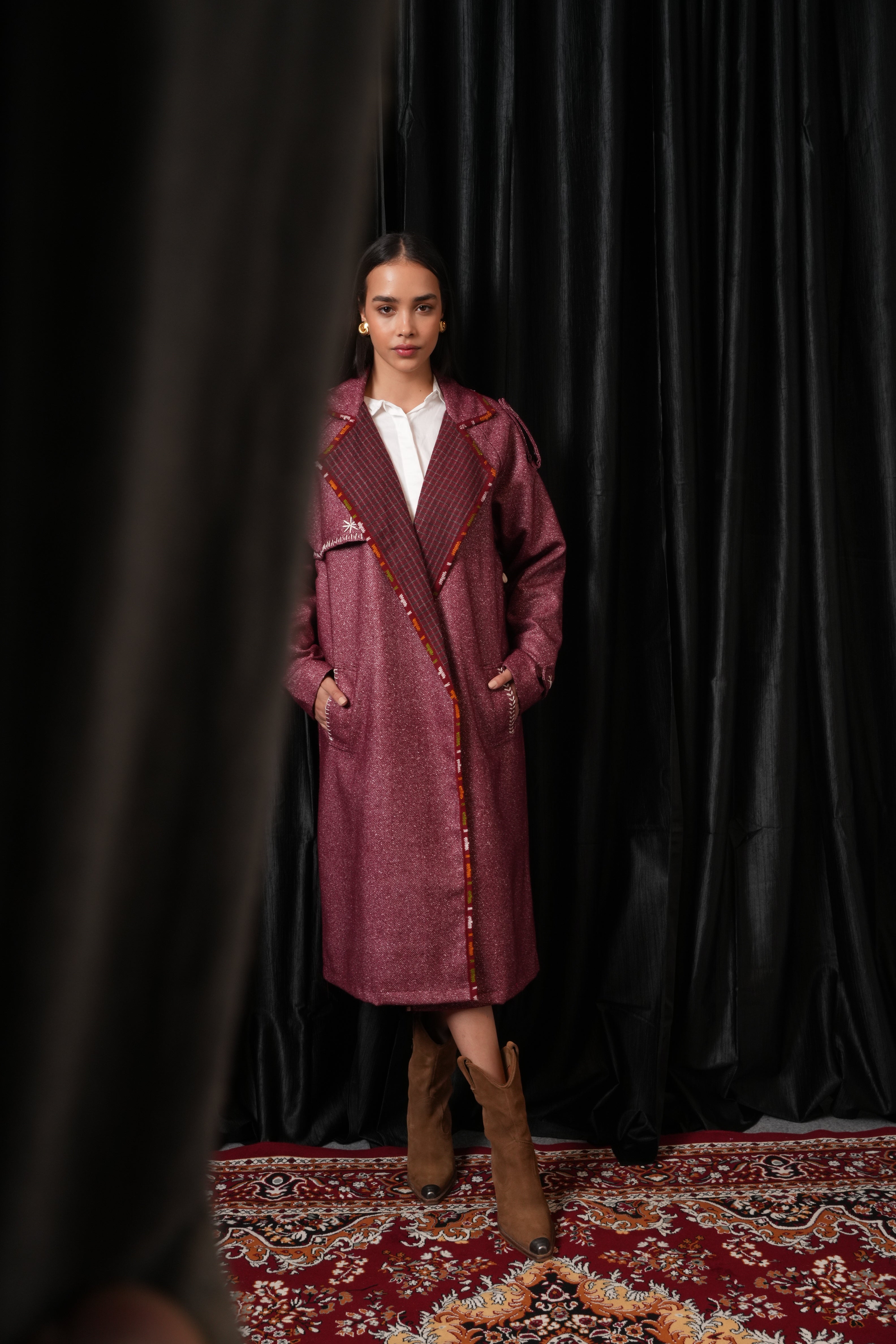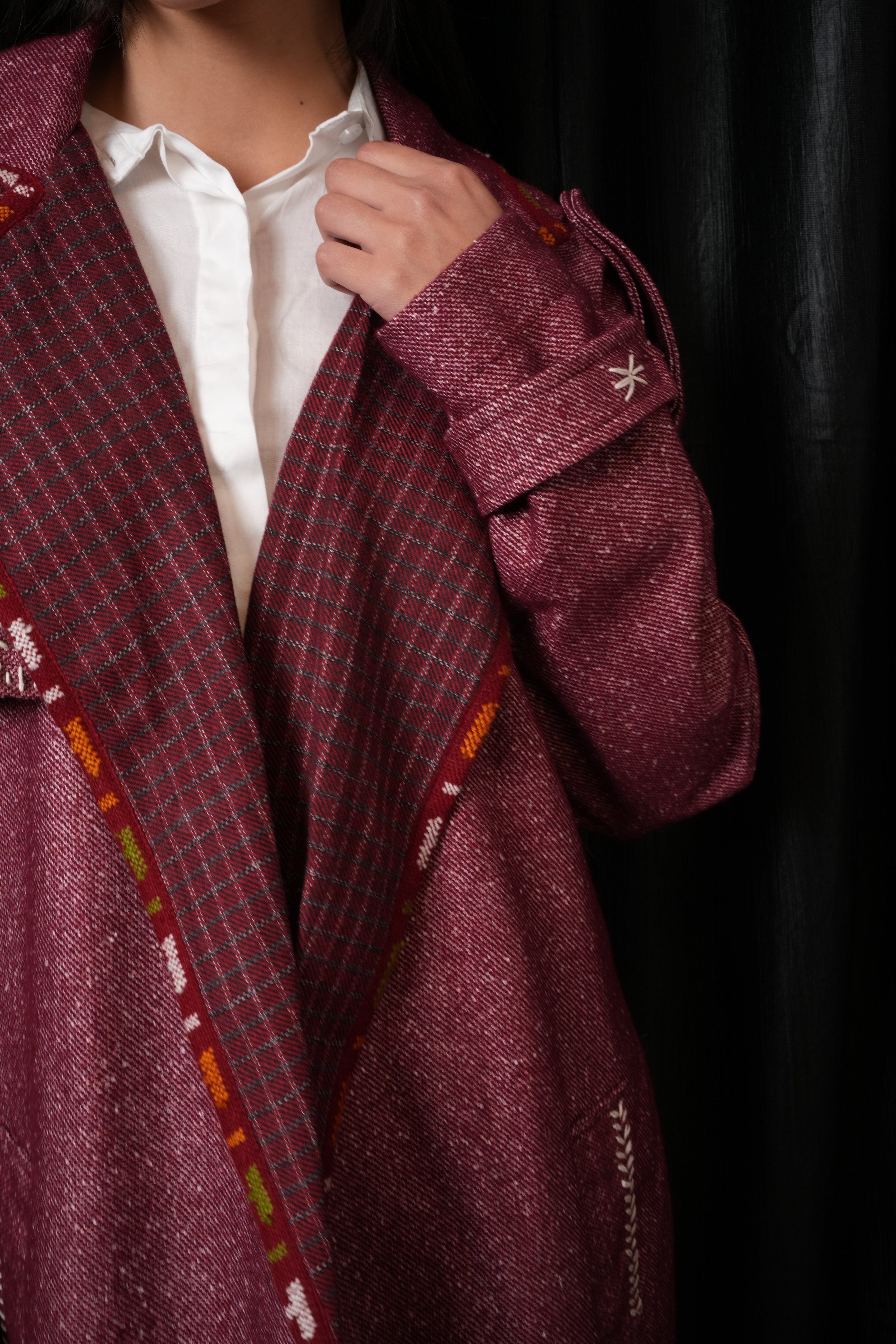 Swaroop Exclusive Design: A sleek trench coat crafted from premium wool blend fabric, designed to make a statement. It features a checked collar with Kullu border patti, adding a traditional touch. The coat includes loops on the shoulders and sleeves for a structured look. Open flaps on both the front and back are enhanced with tattoo-inspired embroidery and shells, combining style and comfort effortlessly.
