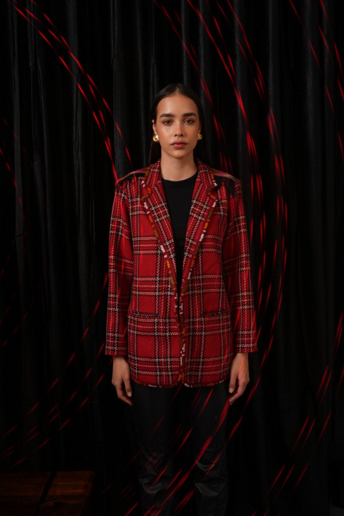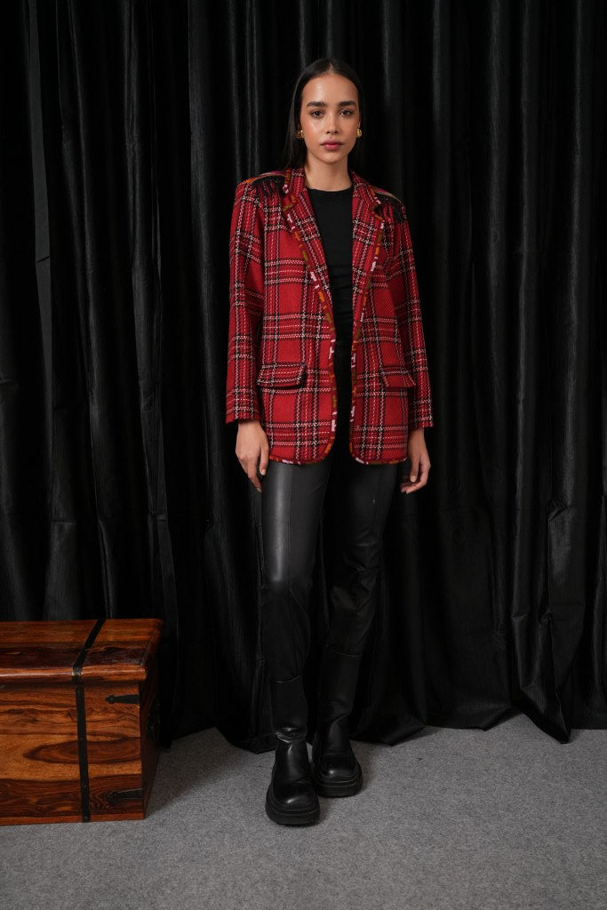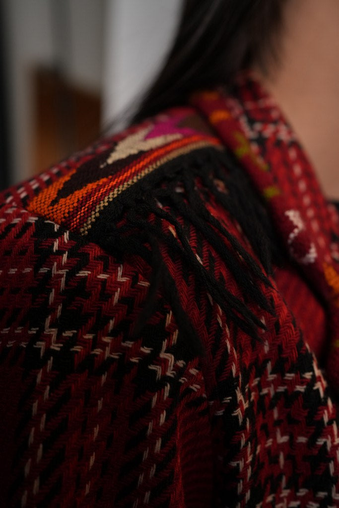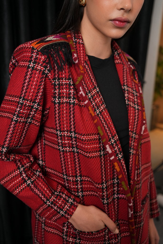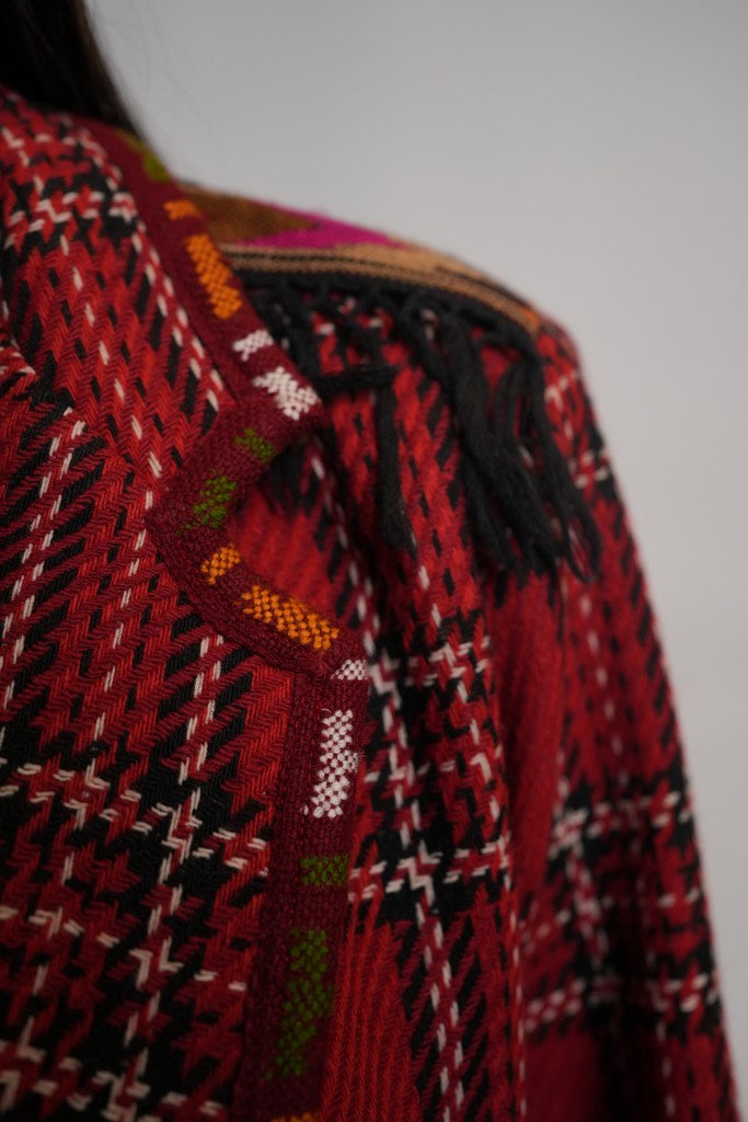 Swaroop Exclusive Design: Introducing the "Kullu Blazer," crafted from a premium wool blend fabric. It features a notched lapel collar enhanced with a Kullu border Patti, while the shoulders are adorned with Kullu borders highlighted by a knotting technique. The blazer also comes with flap pockets for a style touch. Pair this blazer with a simple white shirt and tailored trousers, perfect for both work and evening outings.