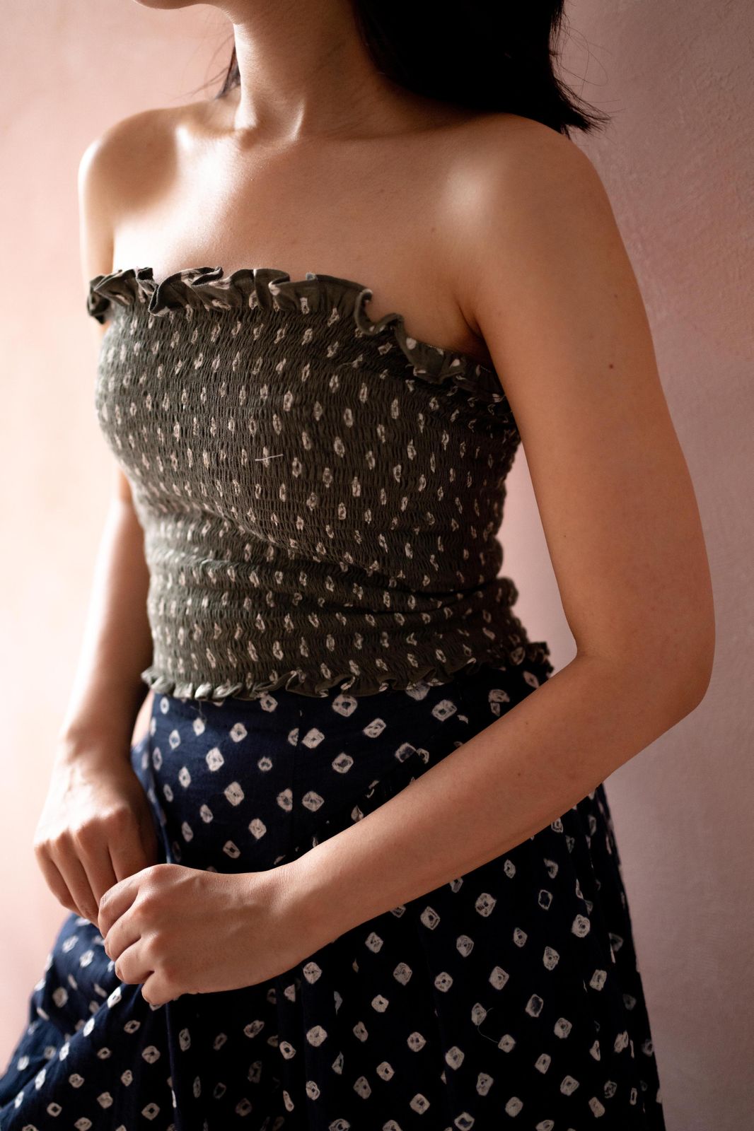 Swaroop Exclusive Design. A cute and breezy Bandhani top made from soft cotton, designed with delicate smocking for a snug yet comfortable fit. Lightweight and airy, it's perfect for warm summer days. The handcrafted Bandhani adds a playful touch of tradition to this modern silhouette. Pair it with our contrast Neelli skirt in deep blue for a striking summer look.