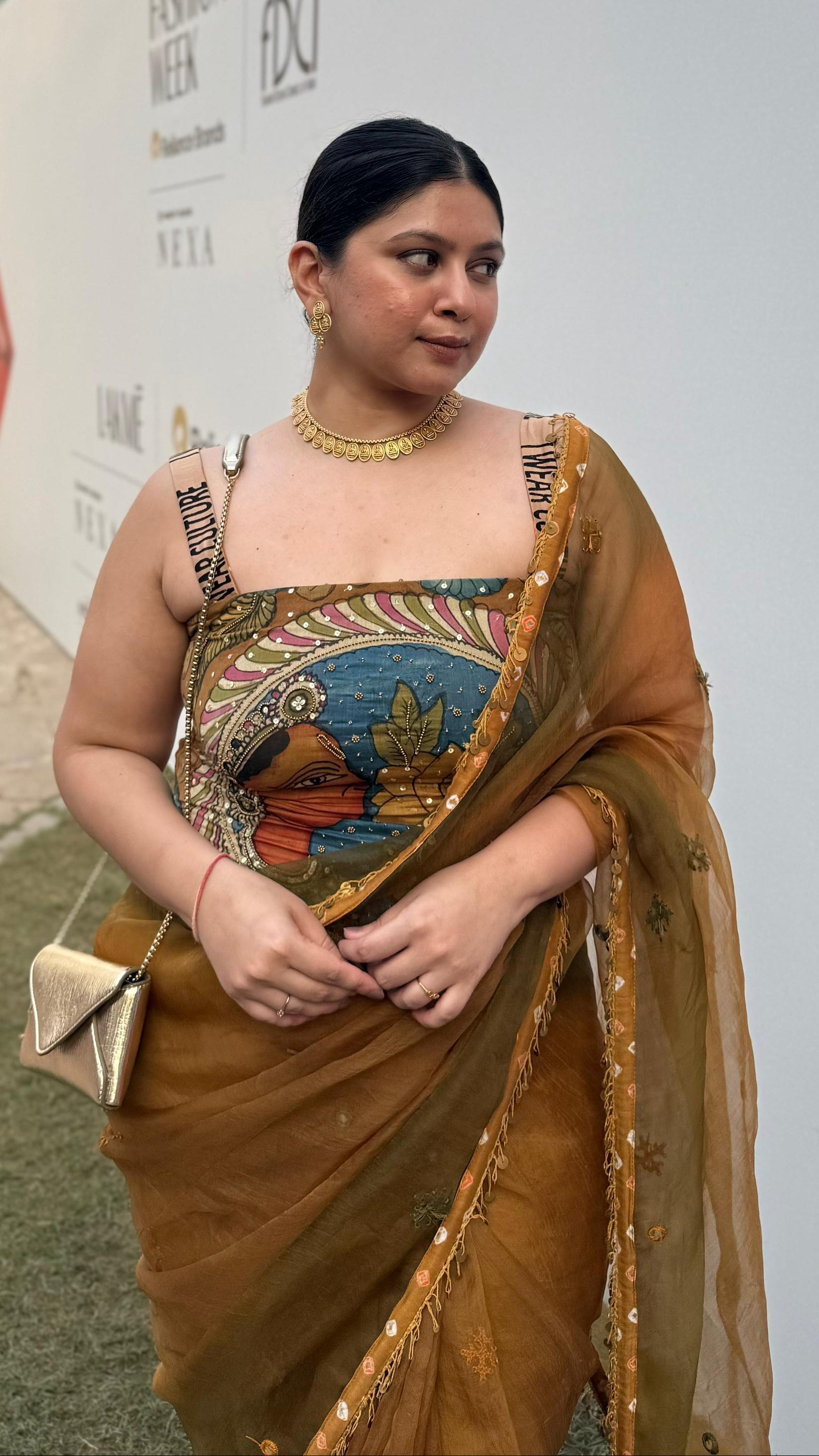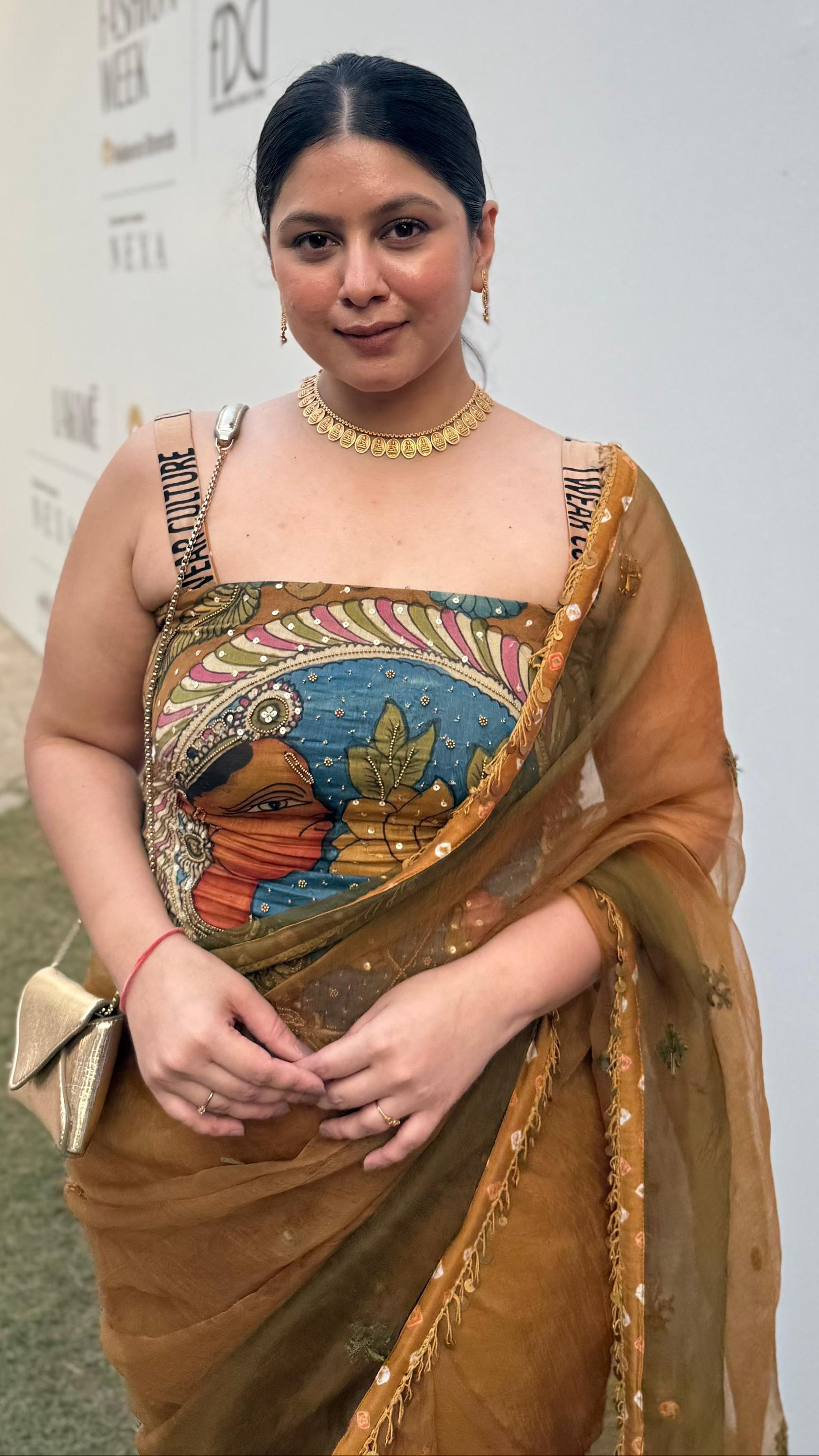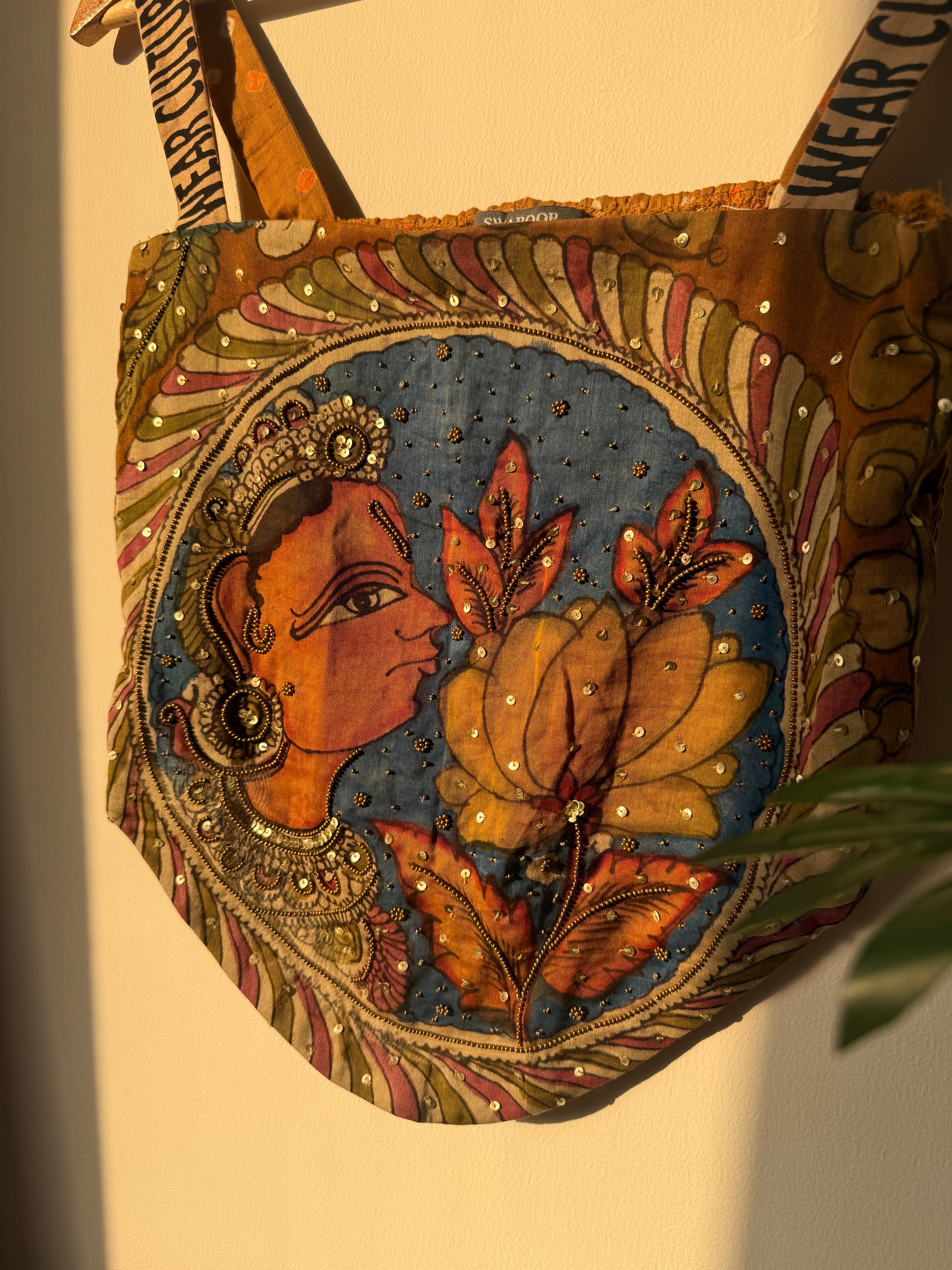 The Swaroop Exclusive Buddha top is crafted from hand-painted Kalamkari fabric created by skilled artisans, celebrating the essence of Indian craftsmanship. The intricate embroidery enhances the beauty of the traditional motifs, adding depth and texture to the design.