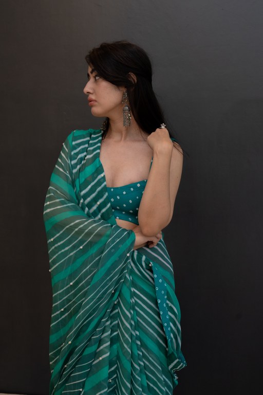 Introducing our latest festive treasure: a pure unstitched chiffon leheriya saree, meticulously crafted by skilled artisans of Rajasthan. The iconic leheriya pattern, with its graceful, flowing stripes, beautifully showcases the rich tradition of Rajasthani craftsmanship. Pair it with our Bandhani Bustier for an exquisite and versatile look perfect for the festive season.